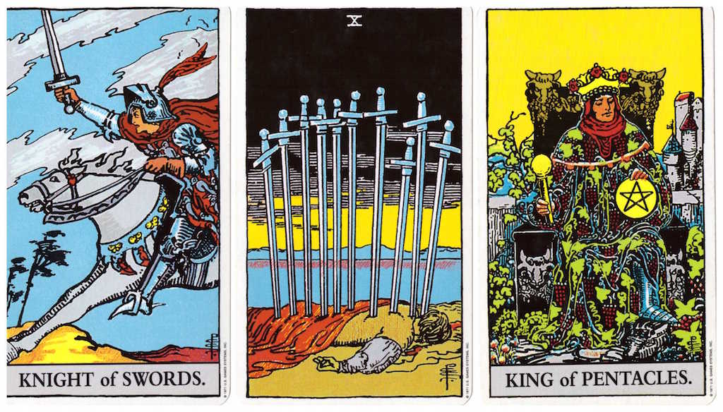 Knight of Swords, 10 of Swords, and King of Pentacles from the Rider-Waite tarot deck. Click image for larger view.