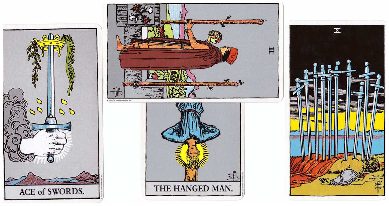 So… the tarot reading. Right! When I saw The Hanged Man, I saw the inverted man’s face (inverted giving the connotation of “inner” and so “lunar”) as the Moon itself eclipsing the Sun behind him. I pulled back to notice the cycle starting with the Ace of Swords and completing with the Ten.