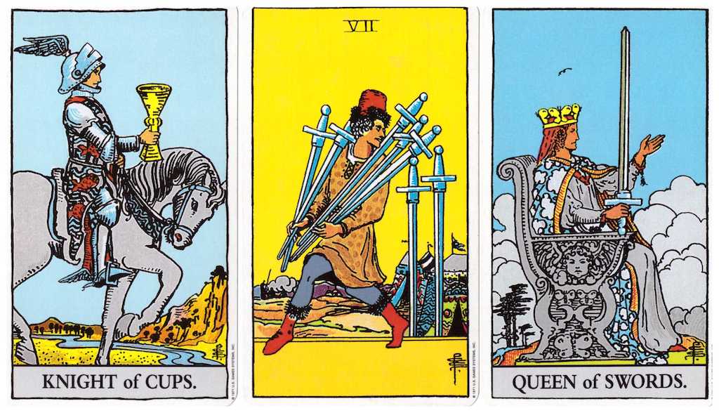 The Knight of Cups can represent some hurt that needs to be released. The 7 of Swords is the bold decision to release it. The Queen of Swords is our renewed commitment to truth. By understanding what is true, here and now, so we can allow ourselves to move beyond its grasp and into a future where we don’t need anyone to fix us, complete us, or fill a role so that we are more in control – or feel more safety – in our lives.