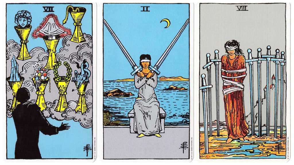 Here’s an exercise using the 7 of Cups as a guiding post while working with the 2 of Swords and 8 of Swords as indicators of what we’re working with – in this case, internal narratives. On one half of a piece of paper, write down a few of your long held dreams or goals. Write a couple new statements too if you want. Then, on the other half, beside each point, write down the first thing that comes into your head about why it hasn’t come about or what could be holding you back. Don’t think about it too much, just write. We want first reactions here. No one but you is going to read this, so leave the guilt at the door, as well as any self-judgements about being immature or irresponsible.