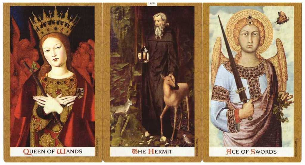 Queen of Wands, The Hermit, and Ace of Swords, from the Golden Tarot created by Kat Black.