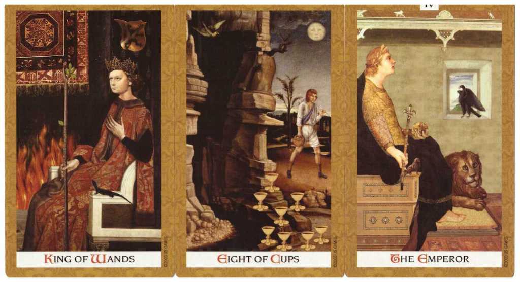 King of Wands, 8 of Cups, and The Emperor, from the Golden Tarot created by Kat Black.