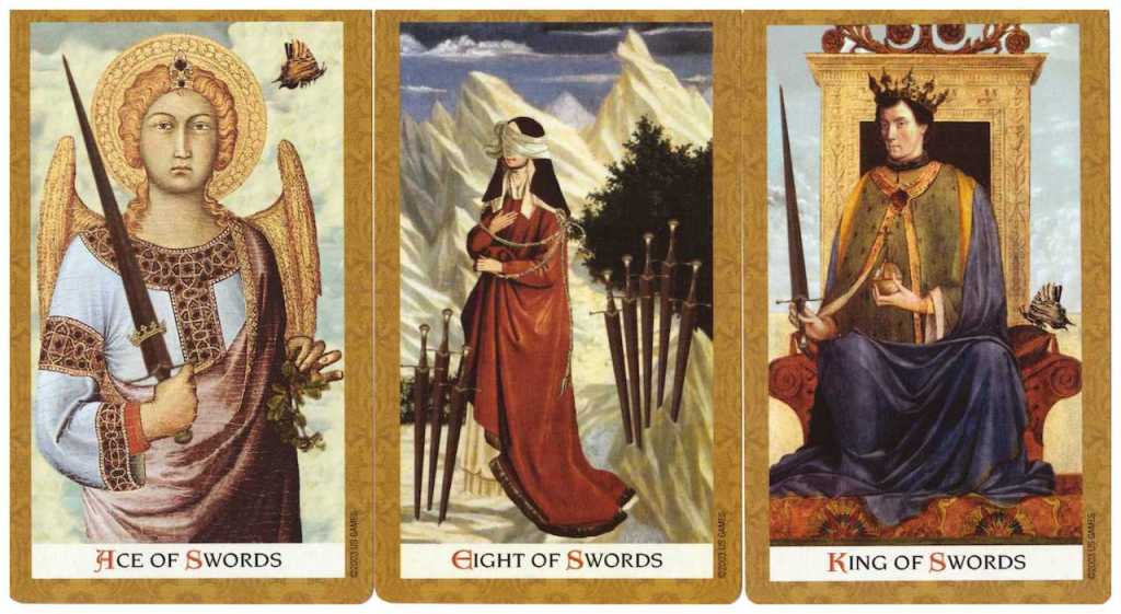 Ace of Swords, 8 of Swords, and King of Swords, from the Golden Tarot created by Kat Black.