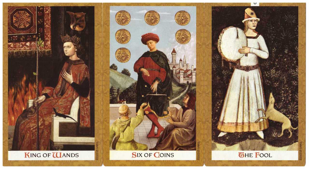 King of Wands, 6 of Coins, and The Fool, from the Golden Tarot created by Kat Black.