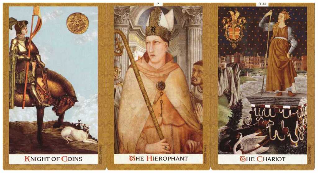 Knight of Coins, The Hierophant, and The Chariot, from the Golden Tarot created by Kat Black.