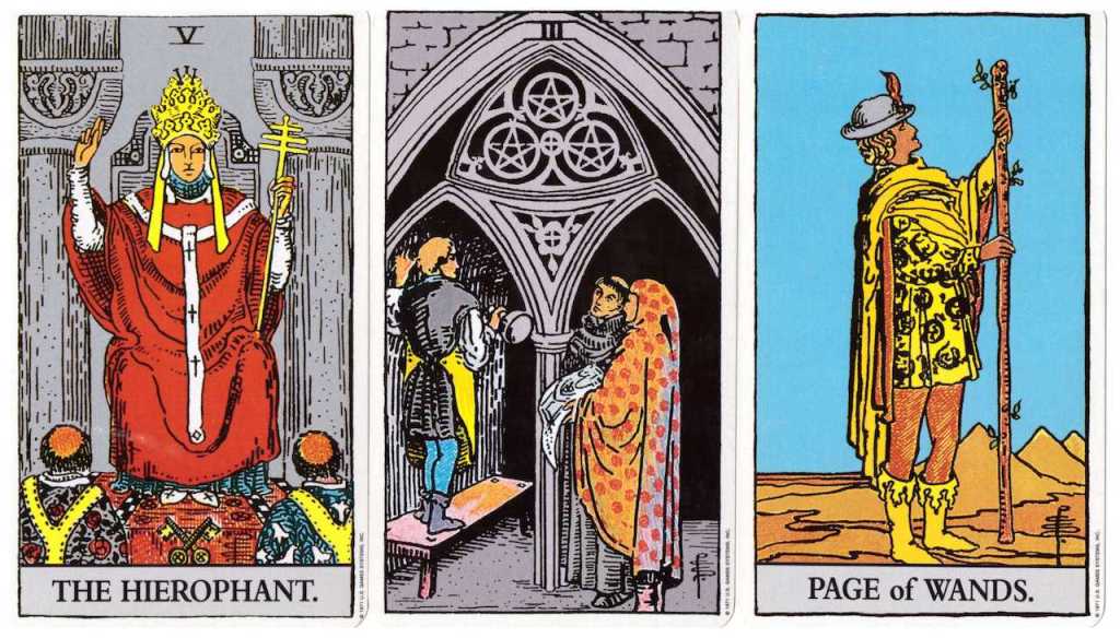 The Hierophant is presenting us with an invitation to come inside and away from problems or toxic situations. He represents our entrance into a safe space where we can explore options that are full of wisdom and sanctity. The movement into this space is an initiation into a new method, a spiritual one, that will yield tremendous insights. There is a blessing to be received here. It may come in the form of a person, or a book that suddenly shows up, or even in the soft voice of a songbird.