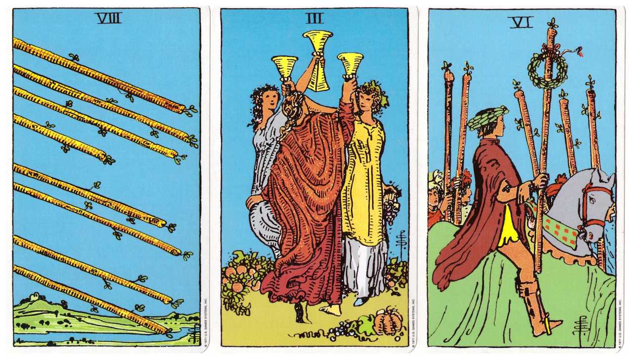 8 of Wands, 3 of Cups, and 6 of Wands, from the Rider Waite Smith tarot deck.