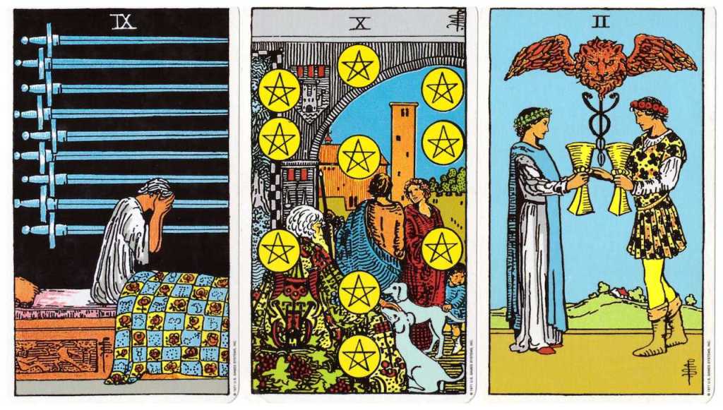 9 of Swords, 10 of Pentacles, and 2 of Cups, from the Rider Waite Smith tarot deck.