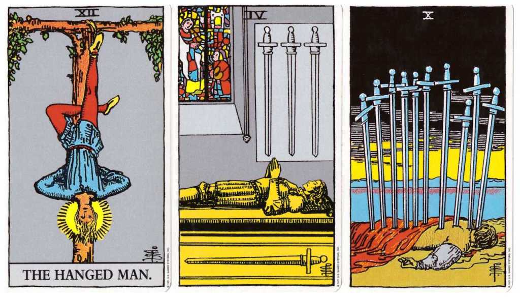 This imagery of being pulled down is heightened by the figure tied on the tree moving to a resting position lying down (4 of Swords), and then further moving to lying on a beach face down (10 of Swords) with the swords that were hung on the wall now grounded through us and into the earth. The emergence is there, shown in the receding dark night and the coming morning.