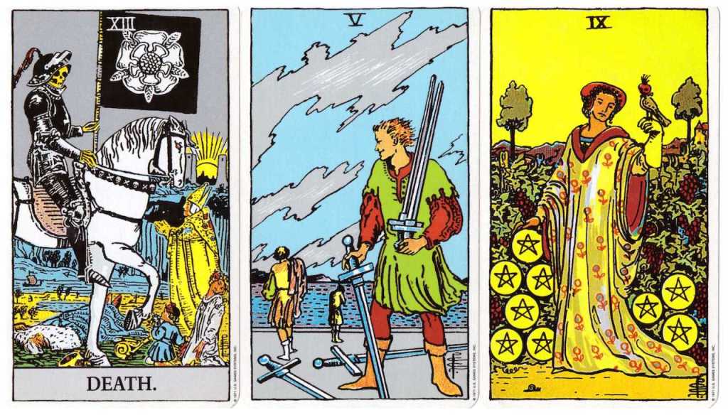 Having the 5 of Swords right next to Death might suggest that we are feeling a bit sad and nostalgic for the past, and that we don’t have as much choice in the changes as we would hope. We might feel like lashing out or extending a level of dominance over others that we feel is being exerted upon us within this process. It’s okay to feel this way but mindfulness is needed so that we don’t keep ourselves from experiencing the changes and growth that is vital for us now.
