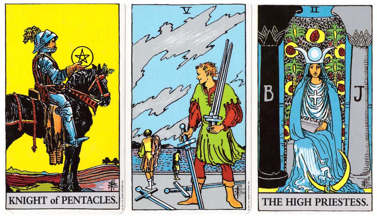 Knight of Pentacles, 5 of Swords, and The High Priestess, from the Rider Waite Smith tarot deck.