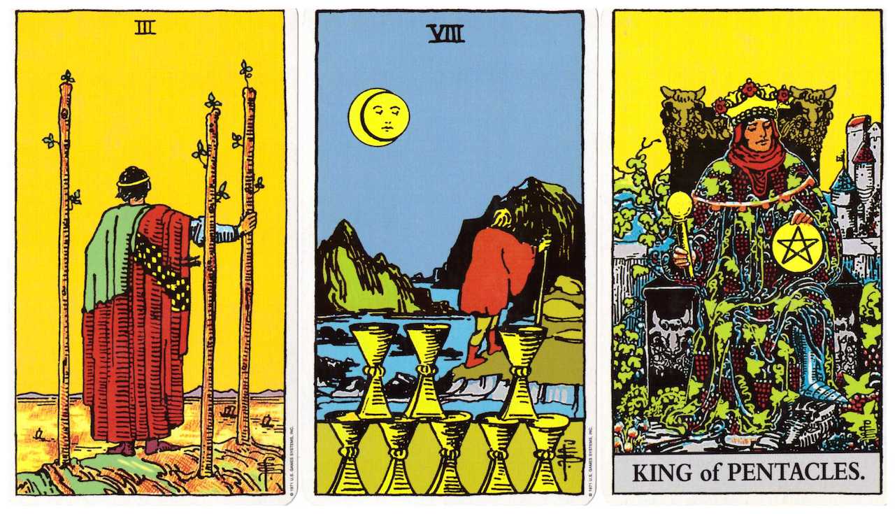 3 of Wands, 8 of Cups, and King of Pentacles, from the Waite-Smith tarot deck.
