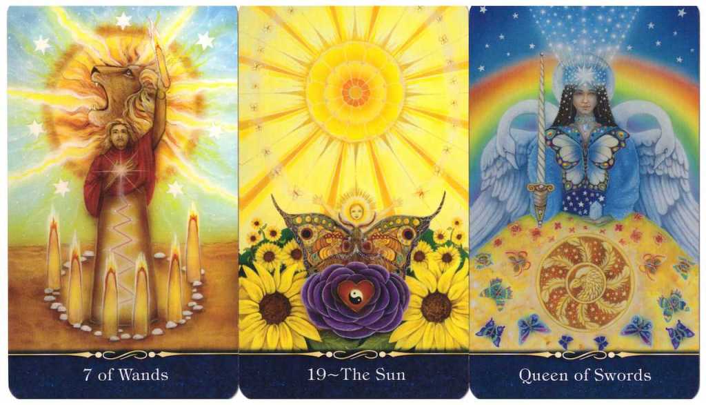 7 of Wands, The Sun, and Queen of Swords, from the The Star Tarot created by Cathy McClelland (www.cathymcclelland.com).