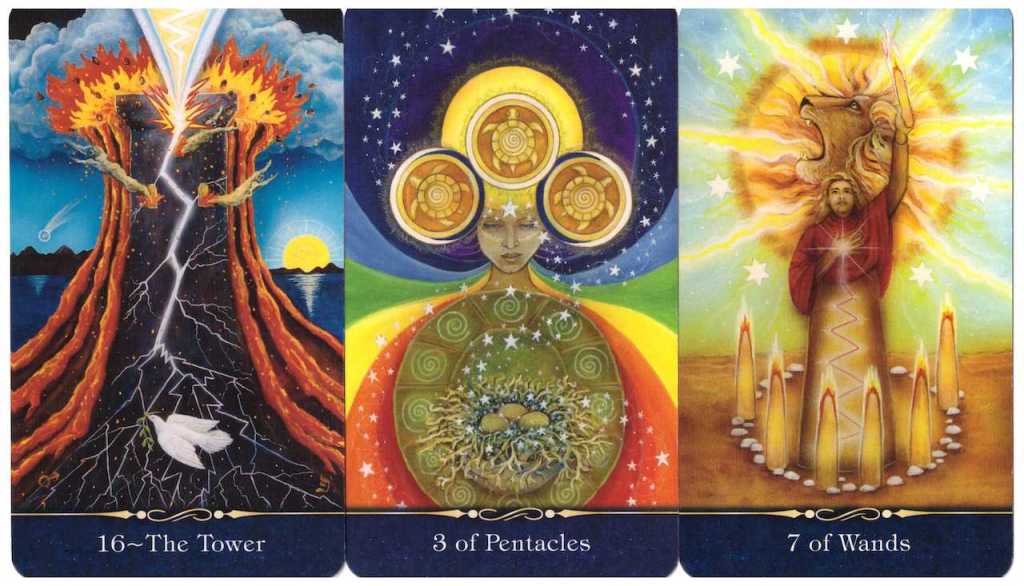 The Tower, 3 of Pentacles, and 7 of Wands, from the The Star Tarot created by Cathy McClelland (www.cathymcclelland.com).