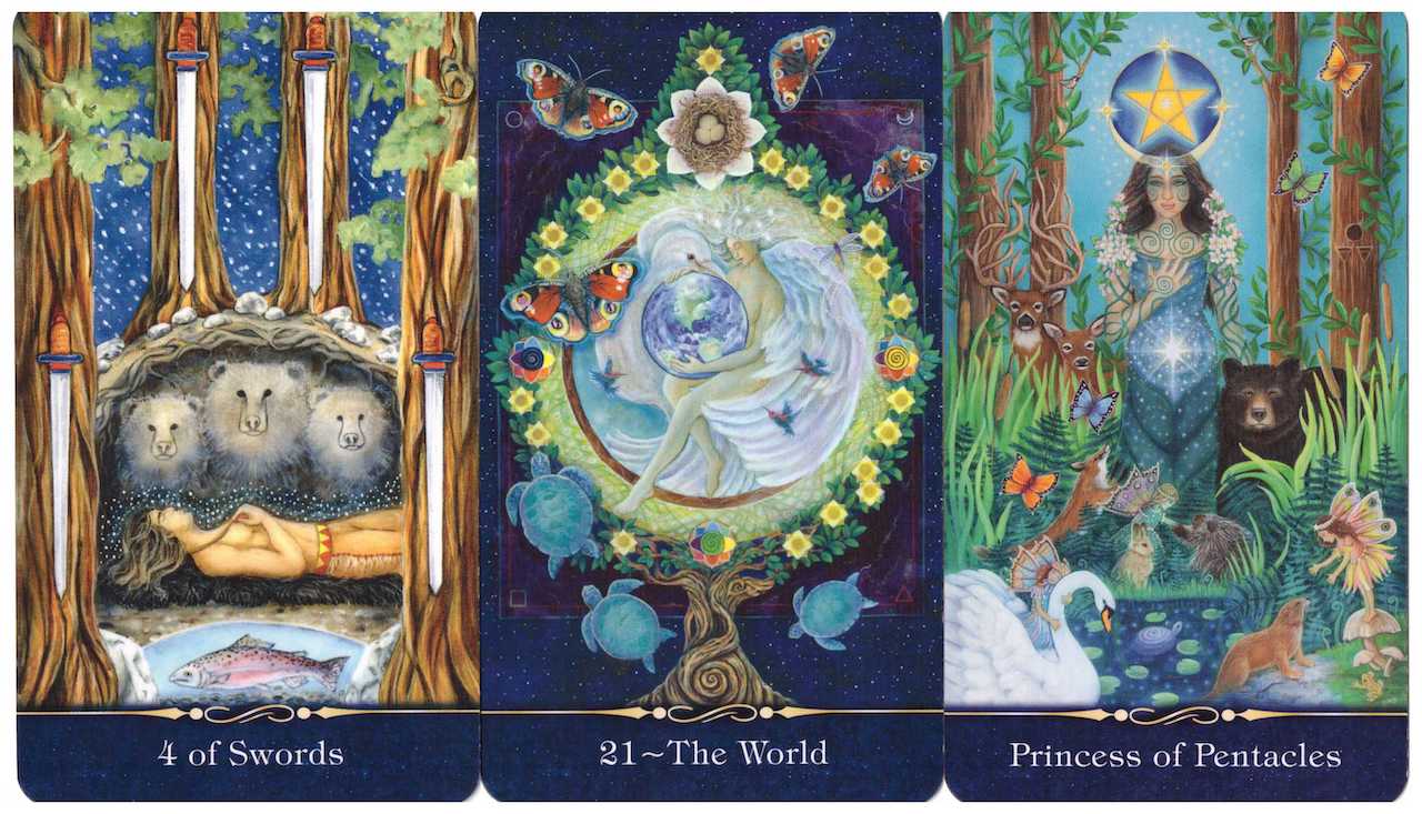 4 of Swords, The World, and Princess of Pentacles, from the The Star Tarot created by Cathy McClelland (www.cathymcclelland.com).