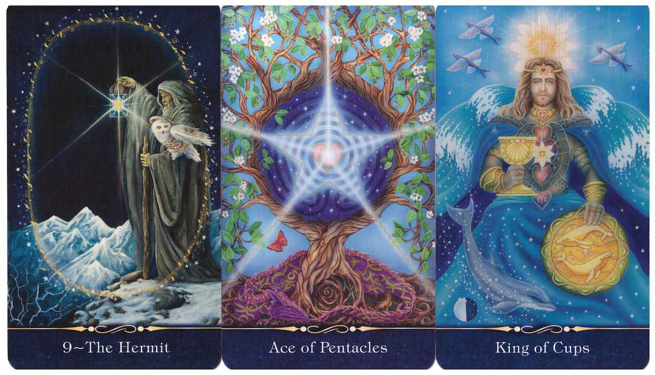 The Hermit, Ace of Pentacles, and King of Cups, from the The Star Tarot created by Cathy McClelland (www.cathymcclelland.com).