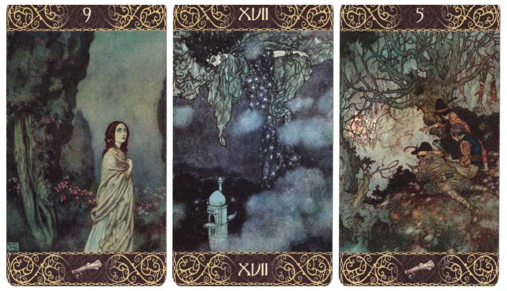 Much like the traditional image of the nude bathing in the calm pool, an element is purified from us and our exposure is about the authentic nature of our being becoming seen. Together with the 9 of Wands, we see a story about how our true nature becomes visible through our commitment to our truth, and our sincere involvement with the world and with others.