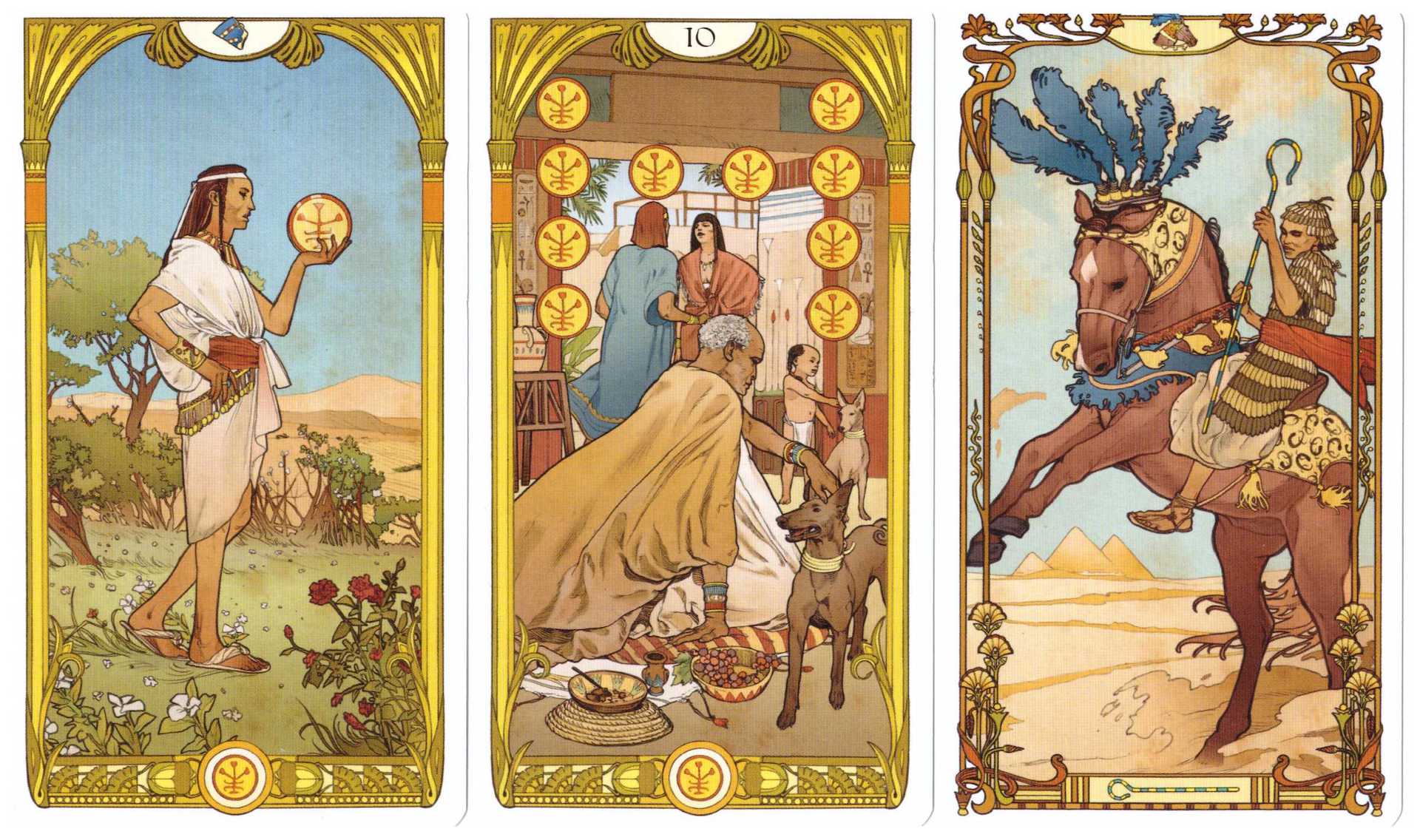 Page of Pentacles, 10 of Pentacles, and Knight of Wands, from the Egyptian Art Nouveau tarot.