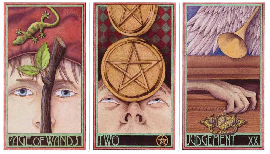 It is as if the Page of Wands looks out at us, a bit lost in his vision as his youthful imagination opens up a playful world of possibilities. Playing at things is the key here. It is the stage where we aren’t defined by rules and deadlines. Everything is possible, and so we are freer to be in contact with what we dare to dream about.