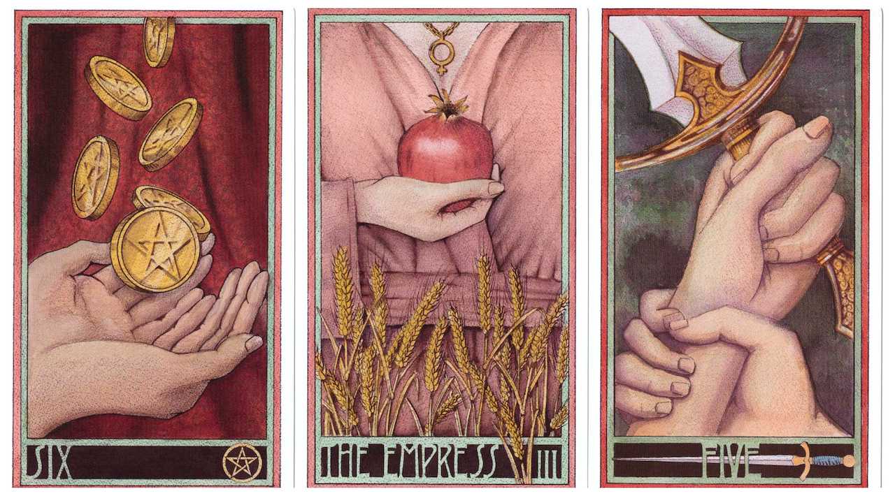 6 of Pentacles, The Empress, and 5 of Swords, from the Erenberg Tarot deck.